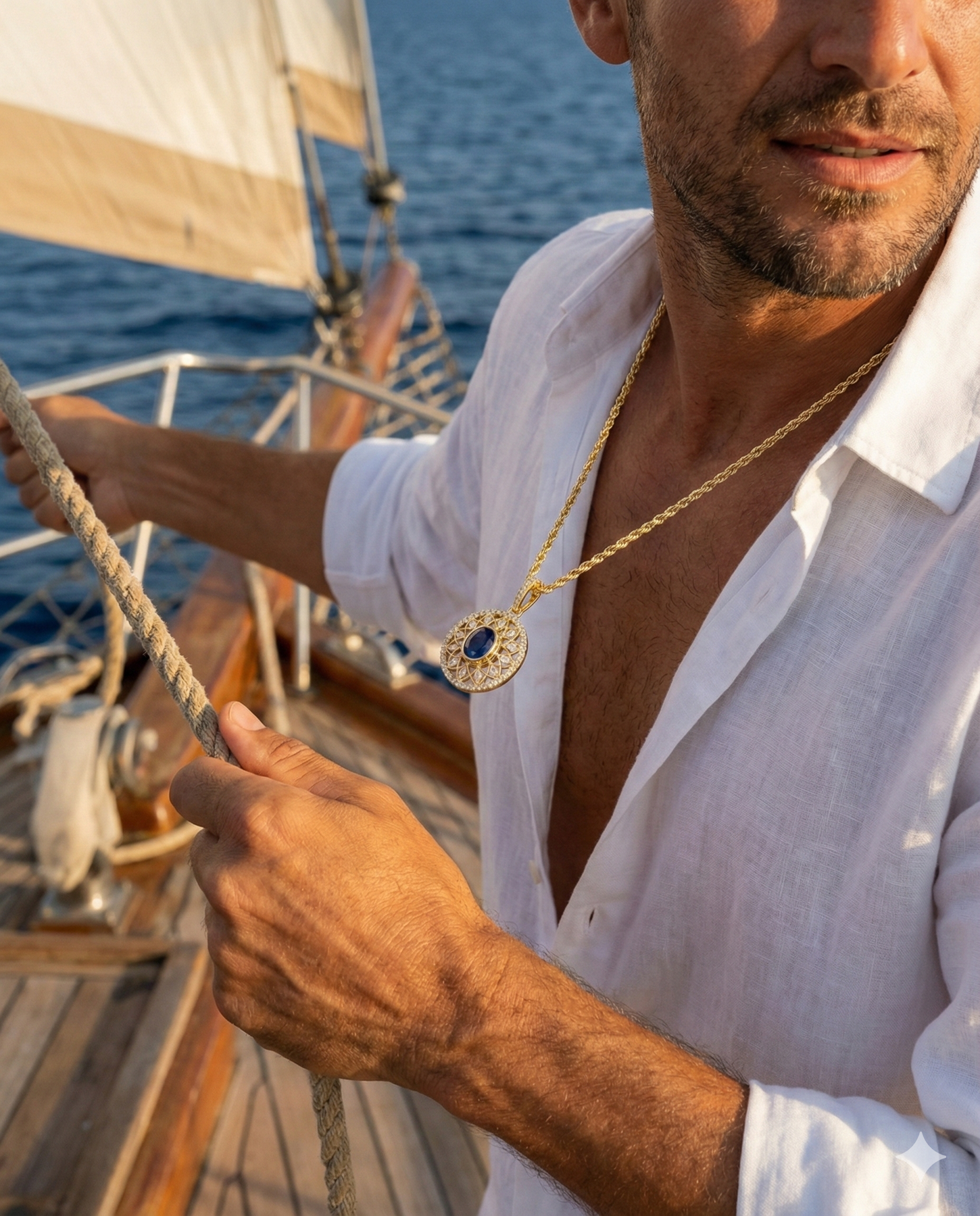 A radiant expression of divine elegance, the Elysian Marquise Pendant is inspired by sacred geometry and celestial grandeur. At its center, a deep blue sapphire glows like twilight over the Aegean, encircled by a halo of VS marquise-cut and pavé diamonds in a starburst lattice of gold. This is a piece that transcends time — opulent yet ethereal, bold yet graceful.
